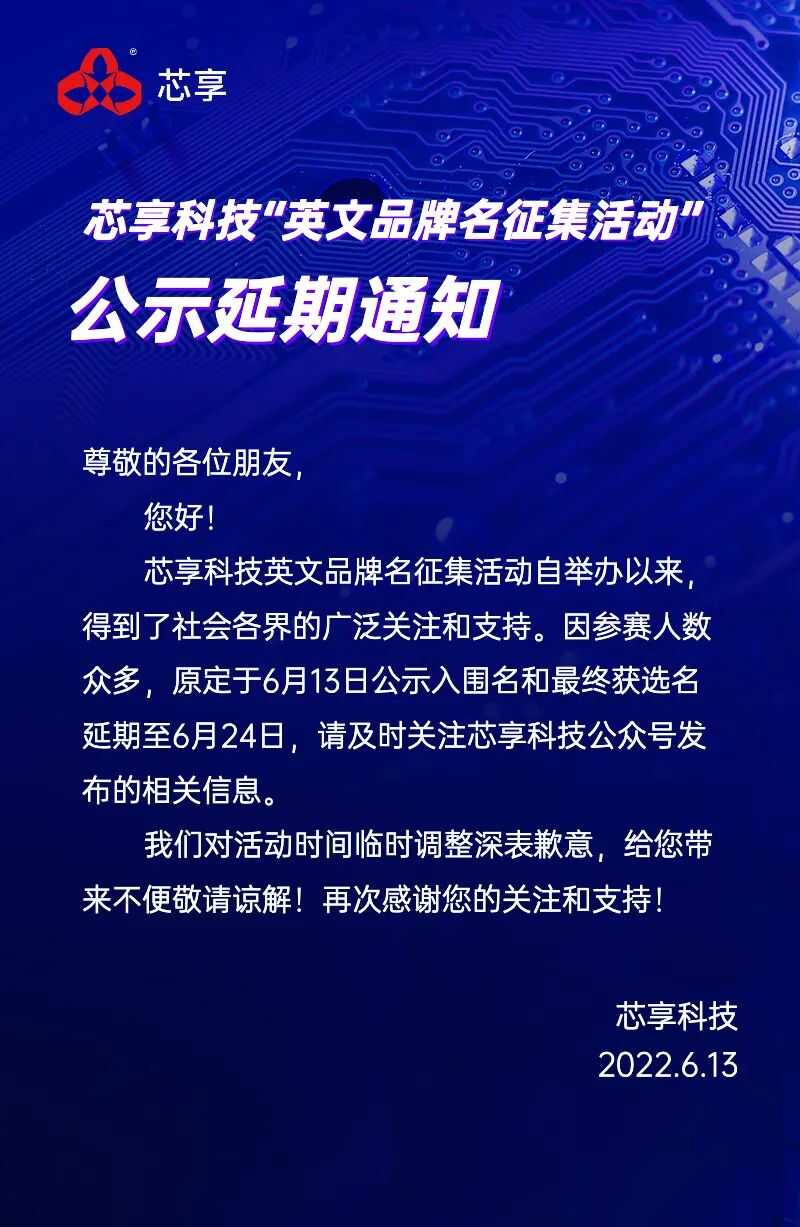 關(guān)于“芯享科技英文品牌名征集活動(dòng)”公示延期的通知